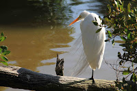 This past Friday, both Mama and Papa were within 3 feet of Tricolor Egrets and about 5 feet from a large group of White Pelicans. They love it. Mama also had to climb out over the water on a mangrove branch in order to reach hooks and a line that as Jeff, the Invasive Species Ranger, said - only a fool could have made such a bad cast! I think I’d rather fish with my mouth instead of using a pole. I had a friend, Cody, who used to “patrol” the beach by his dock and every once in a while he’d plunge his head under water and come up with a big ole fish! I didn’t ever see Cody swallow the fish whole like the birds do, though. He practiced “Catch and Release” quite well.